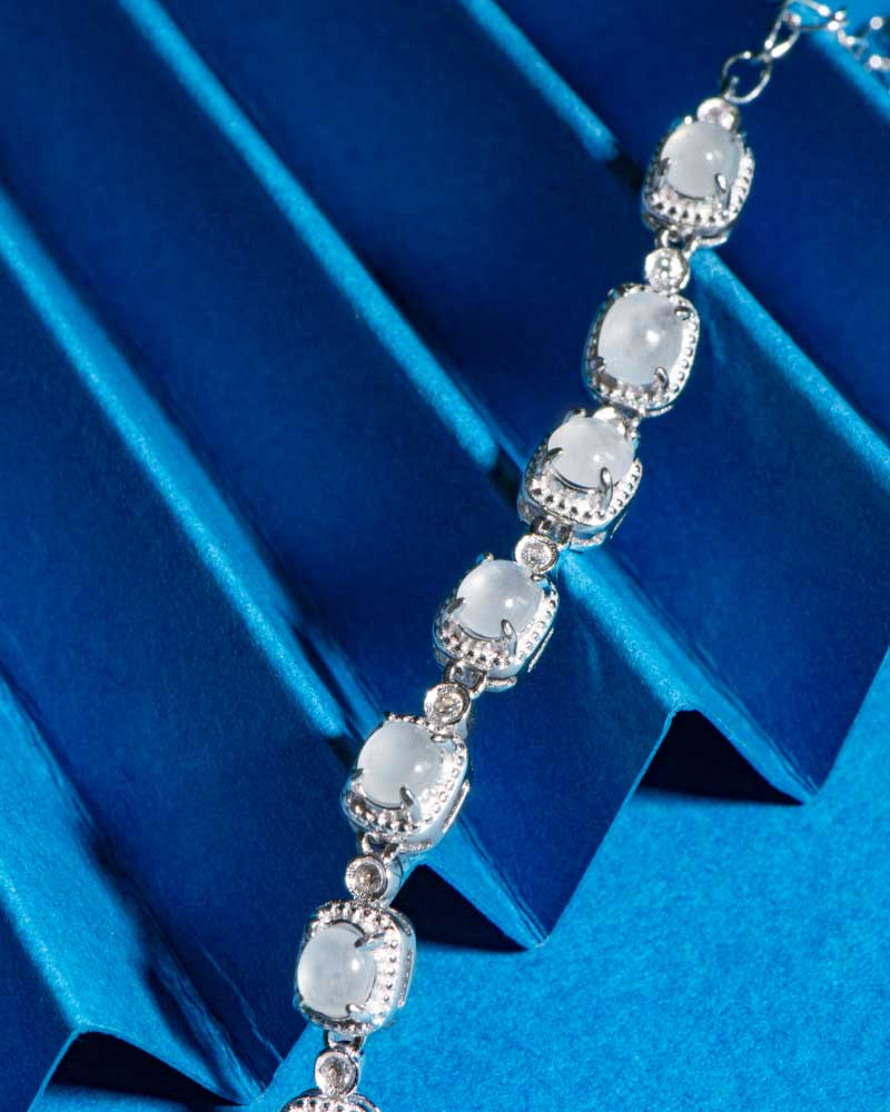 Pure and refined, this bracelet lines up all-white jadeite oval cabochons in a clean, minimalist tennis-style row. The high-polish 925 sterling silver settings keep the look simple and elegant, allowing the stone’s icy glow to take center stage. Finished with an extender chain for an easy, adjustable fit—perfect for everyday wear or pairing with other jade pieces.