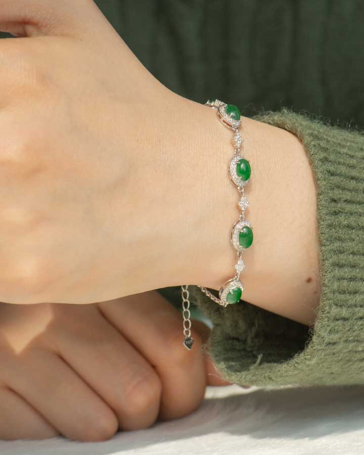 This vivid green jadeite halo link bracelet reads as glassy translucency under light: each oval cabochon holds a concentrated core glow, then releases a clean edge highlight. The color is saturated and precise—designed to stay crisp against polished metal.